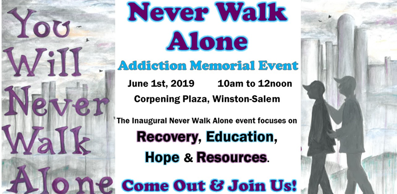 The Inaugural Never Walk Alone event focuses on Hope, Recovery, Education, and Resources. This family-friendly event is the first of its type in Forsyth County, a joint effort by multiple community stakeholders to promote recovery from drug and alcohol addiction. Never Walk Alone aims to educate the community about the disease of addiction, show that people do recover, offer resources to both the addicted and their family/friends, and honor the memories of those who lost their lives to addiction. The event will feature multiple guest speakers and conclude with a walk around the block of Corpening Plaza. Come out and join us!