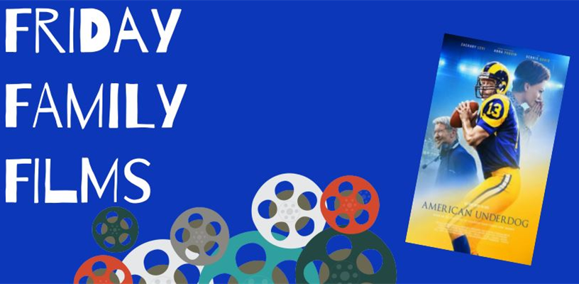 Join us for our monthly Family Films on Friday. We'll be showing "American Underdog" in honor of football season. This film was produced by Lions Gate Film Inc. Football hero Kurt Warner started as an undrafted NFL player and later became a two-time Most Valuable Player awardee who led his team to win the Super Bowl. Before his career could take off, Kurt struggles with the decision of playing football, ending up as a supermarket employee. But with the support of his wife Brenda and guidance from Coach Dick Vermeil, Kurt embarks on a play that would soon change his life. Based on a true story. Starring Zachary Levi, Anna Paquin, and Dennis Quaid. (PG)